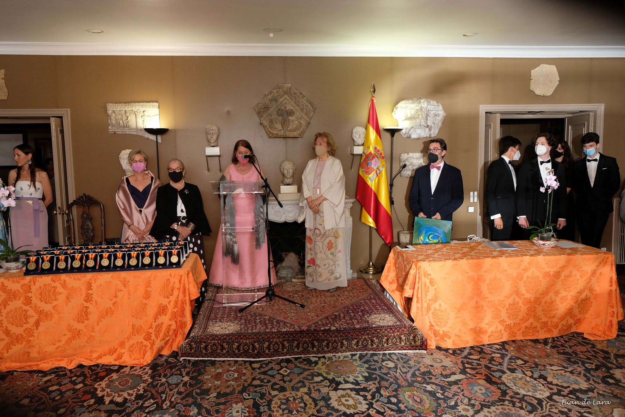 Seguidamente, se comenzó con el preludio a la entrega de estas prestigiosas medallas, en su sexta edición correspondiente a 2020, con Julia Sáez-Angulo leyendo el acta del jurado, presidido por Mayte Spínola y formado por Pedro Sandoval, presidente del citado Grupo; el Príncipe Félix de Merode, vicepresidente; Alicia Pardo, condesa del Valle de Suchill, delegada en América; Elisabeth Martorell Orleans, delegada en Portugal; Belén, condesa de Limburg-Stirum, delegada en Bélgica; doña Francesca Franco, delegada en Mónaco; Cristina Benetton, delegada en Venecia y Borja de Arteaga, marqués de Vívola. Julia Sáez-Angulo, portavoz del GpAyC, actuó como secretaria del jurado.